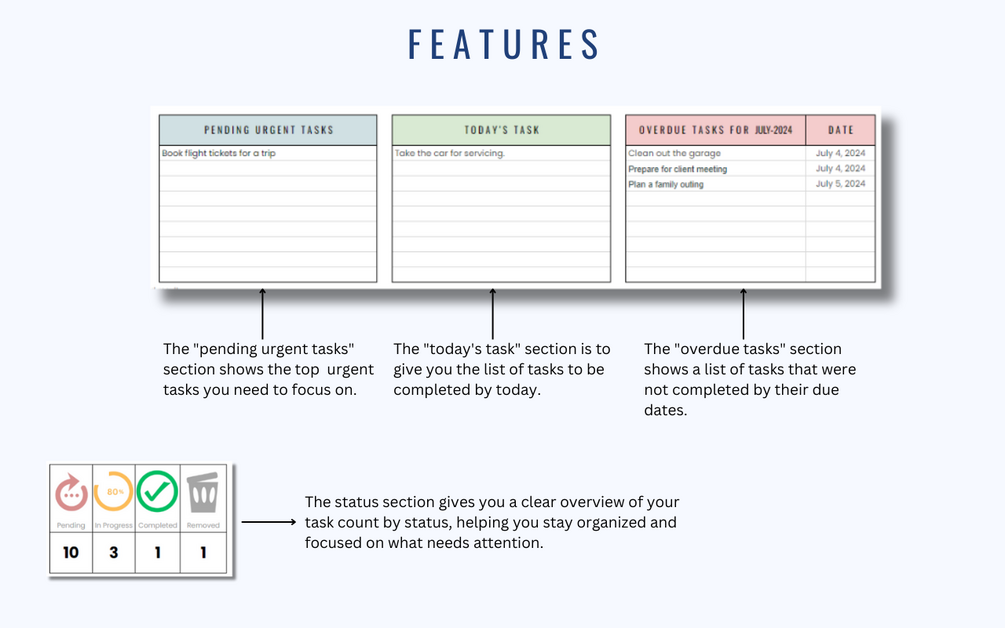 Use the "Highlighters" section to visually identify tasks based on category, priority, and status. Get a quick overview of your progress and priorities at a glance. Quickly identify and prioritize urgent tasks with the "Pending Urgent Tasks" section.
