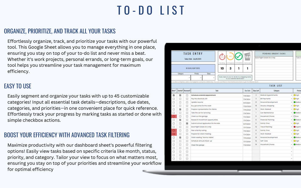 To-Do Google Sheets is a tool for organizing, tracking, and prioritizing tasks with ease. With this sheet, you can keep track of everything you need to do in one place. Just follow the instructions on the sheet to get started. You can customize your task categories, see your progress at a glance, and even print out your tasks if you need to.