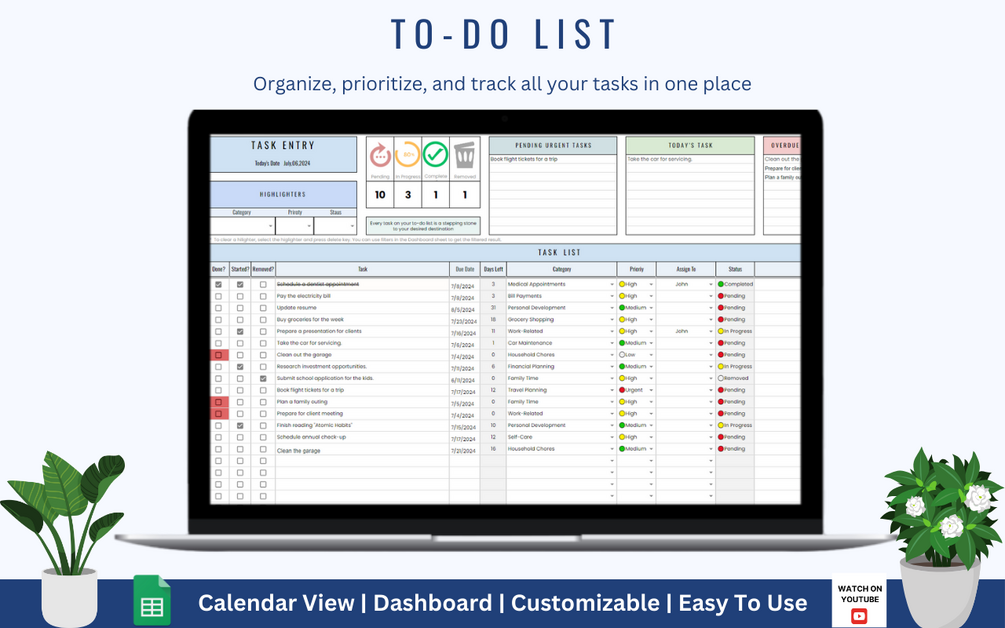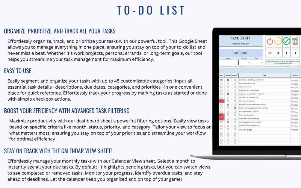 To-Do List Google Sheets is a tool for organizing, tracking, and prioritizing tasks with ease. With this sheet, you can keep track of everything you need to do in one place. Just follow the instructions on the sheet to get started. You can customize your task categories, see your progress at a glance, view all your tasks in a calendar and even print out your tasks if you need to.