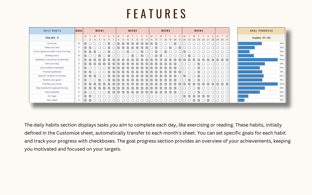 We’ve included simple instructions to help you get started with the habit tracker right away, no matter if you’re a beginner or have used similar tools before.